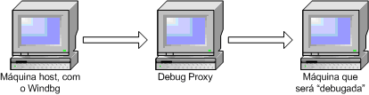 • Debug remoto por meio de debug Proxy, para quando você não pode efetuar conexão direta (via TCP/IP ou serial). Com o WinDbg, você conectar a um WinDbg em outra máquina, que então conecta em outra máquina para debug, como no diagrama abaixo